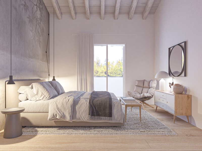 - al piano terra: zona giorno di 45 mq. con cucina separabile, disimpegno e bagno finestrato, da cui si accede agli ampi portici esterni