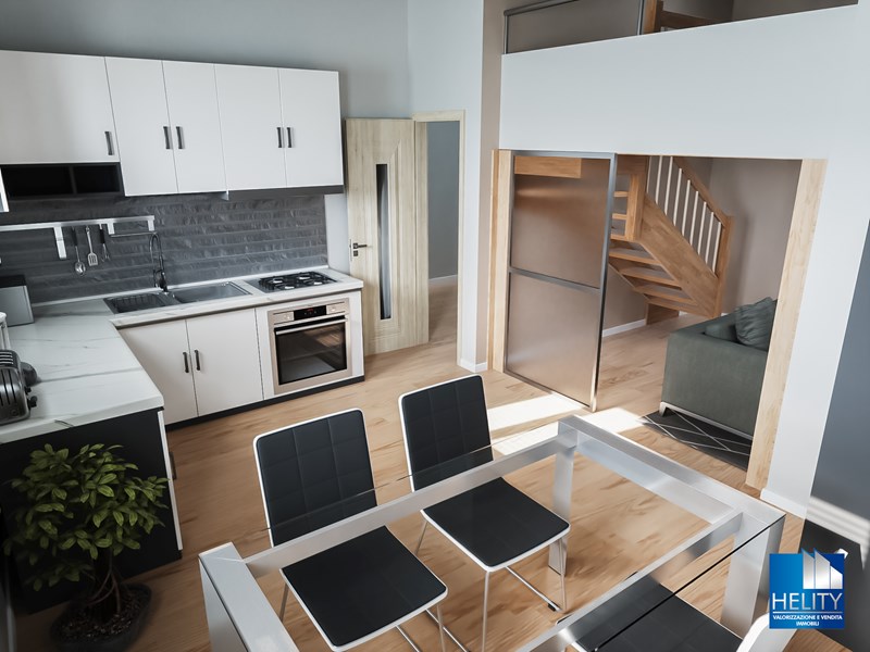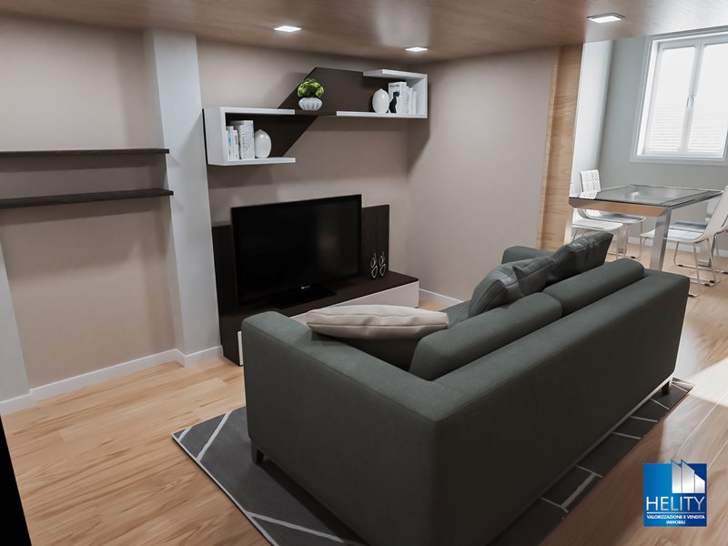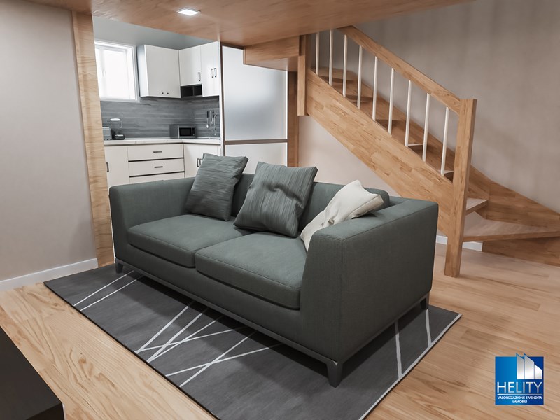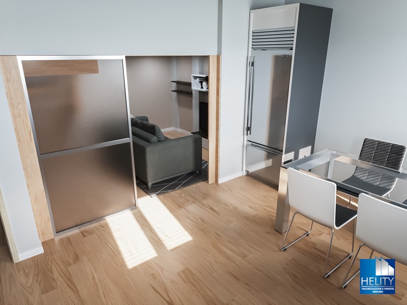 Composto da: ingresso con possibilità di realizzare un armadio a muro/cabina armadio, cucina a vista suddivisa con vetrata scorrevole dalla zona living, camera matrimoniale e bagno finestrato con box doccia. Completa la proprietà una Cantina ciclabile al piano S1