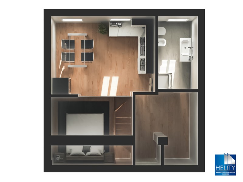 Nel render foto-realistico rappresentato nell’annuncio, è presente una delle varie possibilità di configurazione interna, ideata con spazi ben sfruttati per rendere l’immobile funzionale e senza dispersione di metratura.