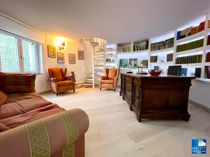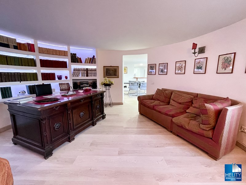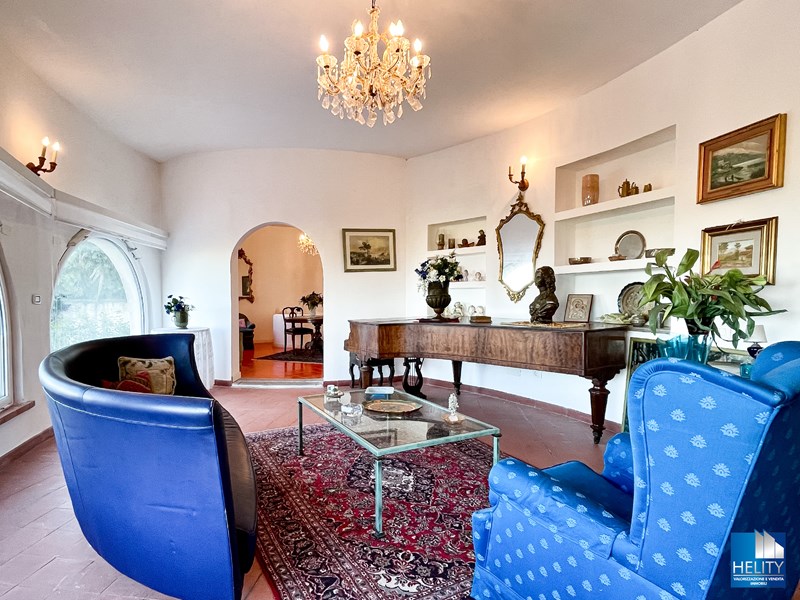 La composizione è la seguente: la villa è suddivisa principalmente su due livelli: piano terra composto da uno spazioso atrio d’ingresso che introduce alla luminosa zona giorno impreziosita da grandi vetrate che danno accesso alla terrazza coperta e al giardino interno adornato da piscina riscaldata dotata di nuoto controcorrente e zona relax, cucina abitabile con camino, quattro camere da letto, vano studio con ulteriore accesso al terrazzo e due bagni padronali.
