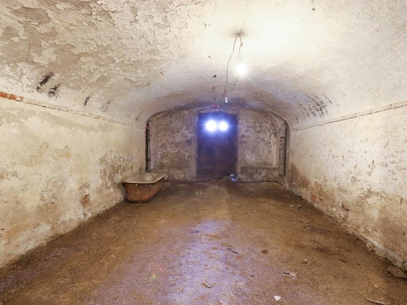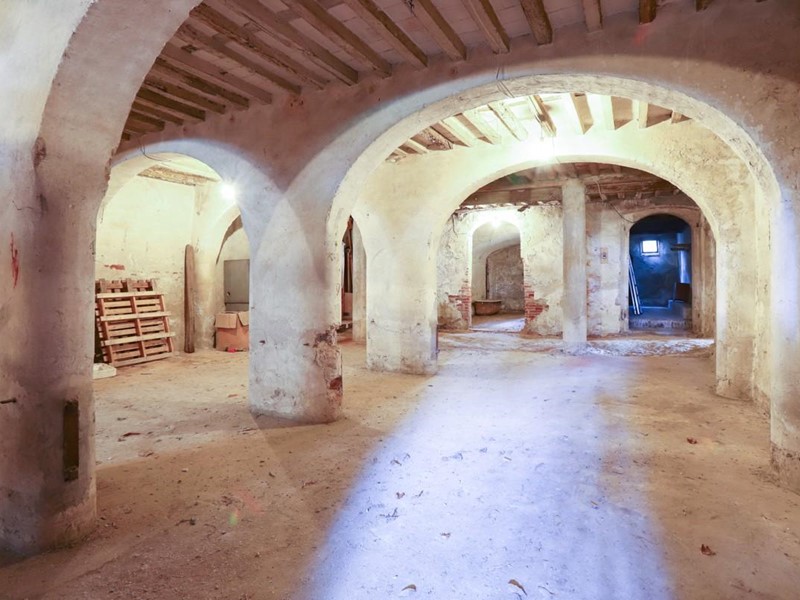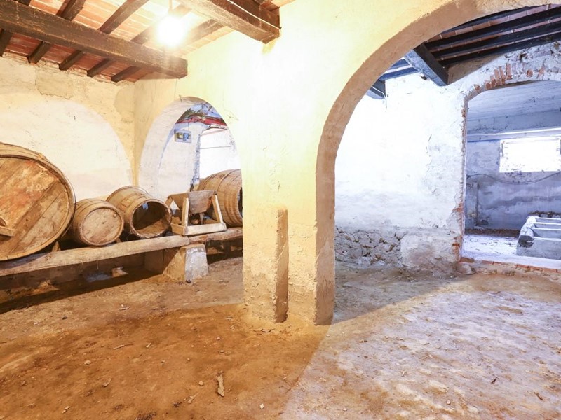Il piano seminterrato costituito dalla cantine e dalle stalle è caratterizzato da soffitti a botte, soffitti a crociera e soffitti in travi e travicelli che si alternano fra i vari ambienti, è presente inoltre una stanza dedicata al ricovero vino con grandi tini in cemento, le rifiniture e la manutenzione interna è rimasta pressoché invariata dalle origini della costruzione in quanto anche attualmente sono poco utilizzate.