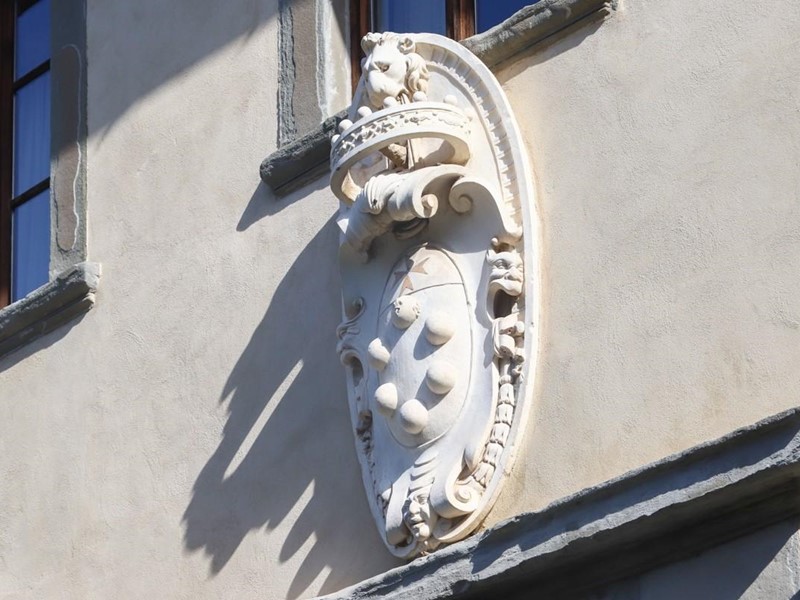 L’ingresso principale accessibile da un grande portone antico porta ancora lo stemma originale perfettamente conservato della casato suddetta.