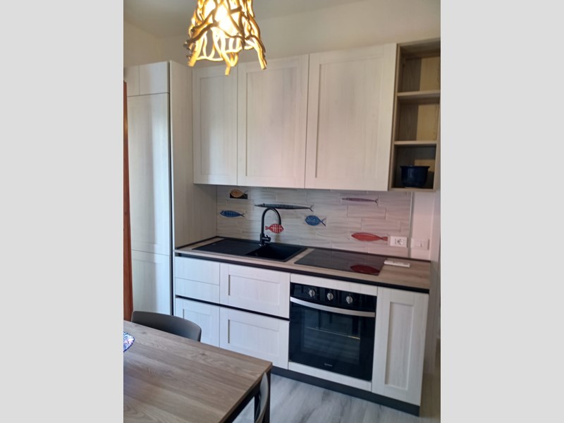 Si compone di: 1) zona giorno con tavolo per 4 persone allungabile (6 posti) , cucina attrezzata con frigo, congelatore, forno, piastre a induzione e letto matrimoniale a ribalta - 2) zona notte con letto matrimoniale, con grande armadio a ponte, 3) zona disimpegno con grande armadio 4) bagno con box doccia in cristallo.