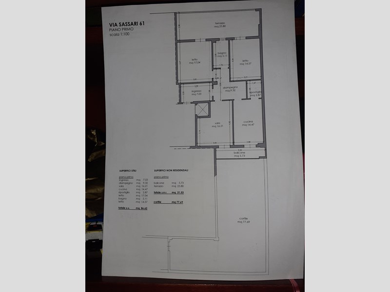 Appartamento da ristrutturare dotato di un secondo  ingresso indipendente sito al primo piano scala B  del condominio di 5 piani e 25 appartamenti al numero civico 61 di via Sassari. L'immobile si compone di 2 camere letto doppie e 1 bagno che affacciano su un terrazzo a livello  di 25mq vivibile, e di un soggiorno e una cucina  abitabile  con  dispensa  comunicante  che  si  affacciano  su un terrazzino coperto di circa 6mq  dal quale una  scala  in uso esclusivo conduce  al cortile privato che da accesso al secondo ingresso indipendente. L'edificio si trova a una distanza massima di dieci minuti a piedi