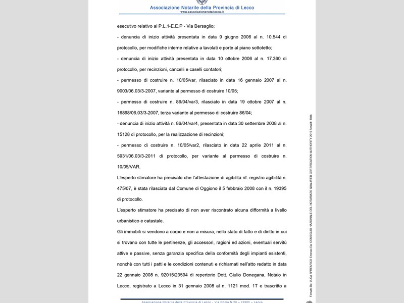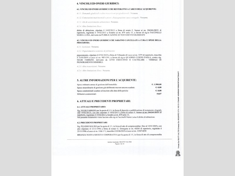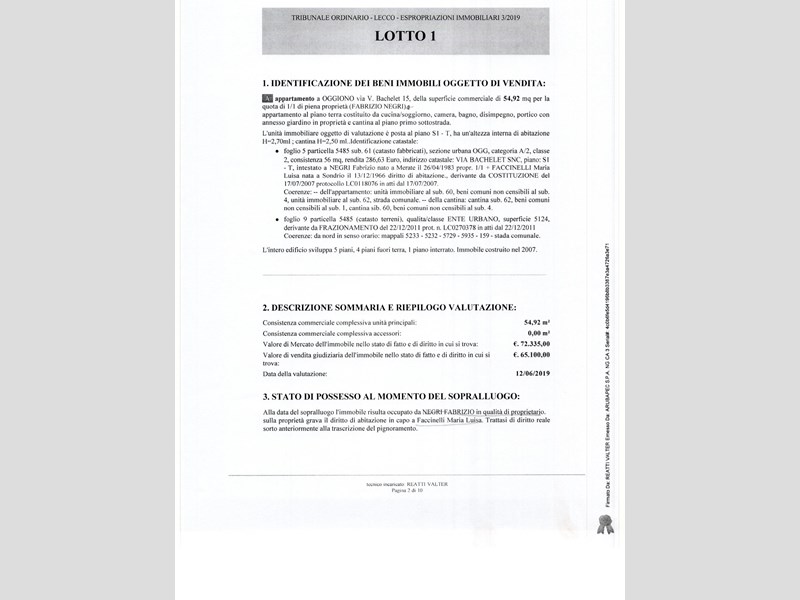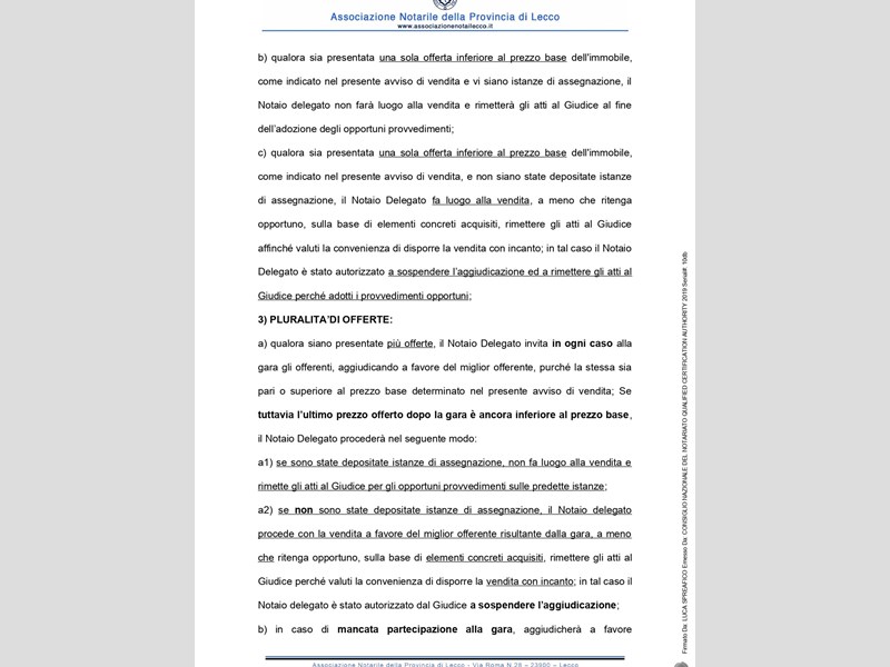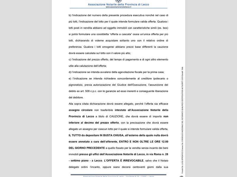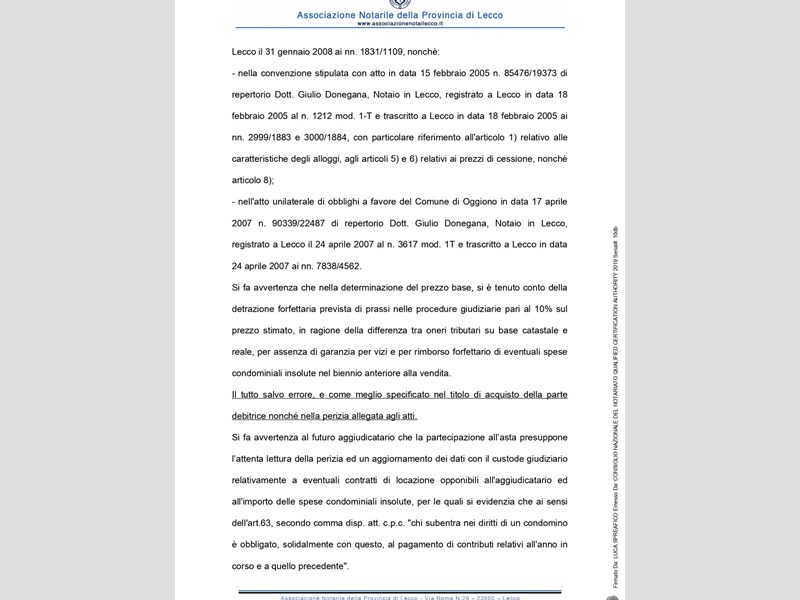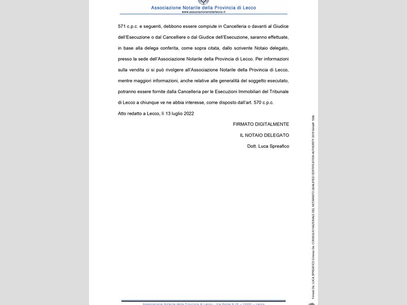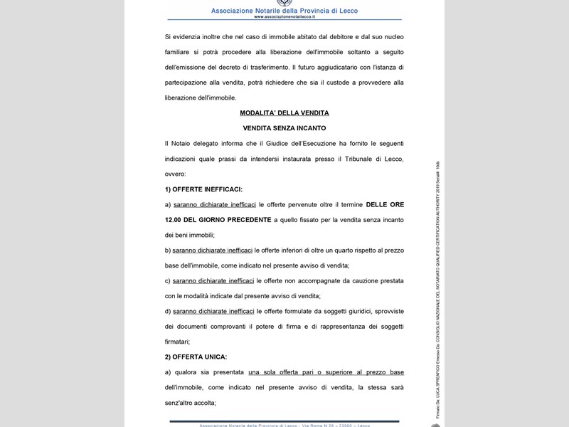 Si avverte che gli interessati potranno rivolgersi al custode per ricevere tutte le informazioni utili per formulare una proposta di acquisto e visitare l'immobile. I recapiti del custode sono: Avv. Ivana Montani, tel. 0341283110; email: ivana.montani@libero.it: studio in Lecco il 22.7.2022 si pubblica l'avviso di vendita senza incanto per il giorno 16.11.2022 ore 14.30 (file pdf caricato), con prezzo di base € 57.450 con aumento di € 1000
