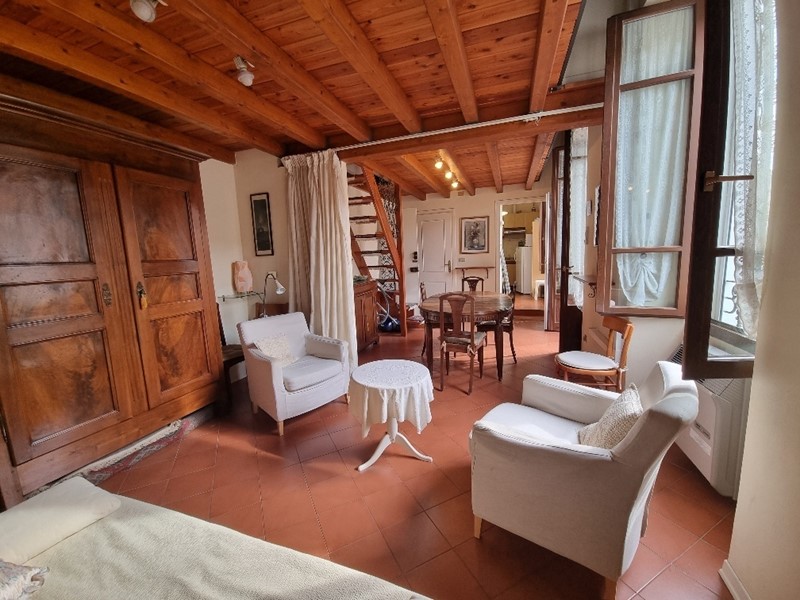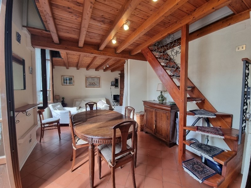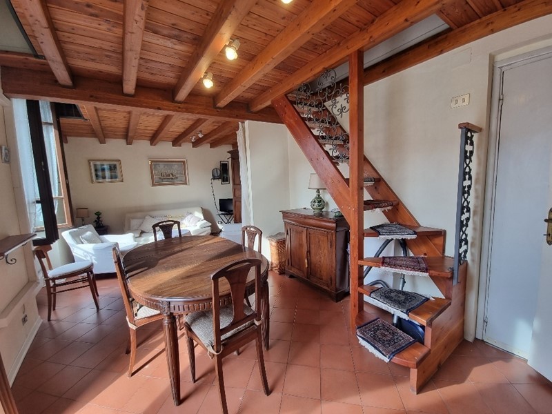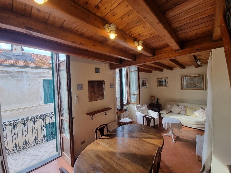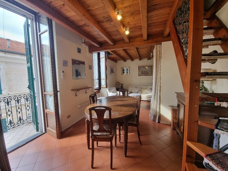 Vendesi a Diano Marina appartamento in piccola palazzina al secondo ed ultimo piano composto da cucina abitabile, sala, bagno e balcone più un soppalco con camera passante e camera matrimoniale. Riscaldamento autonomo, aria condizionata vista sul centro storico. Minime spese di condominio