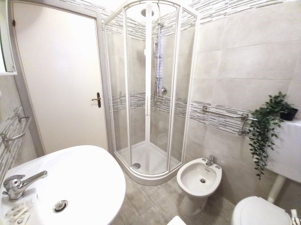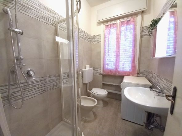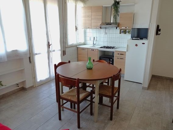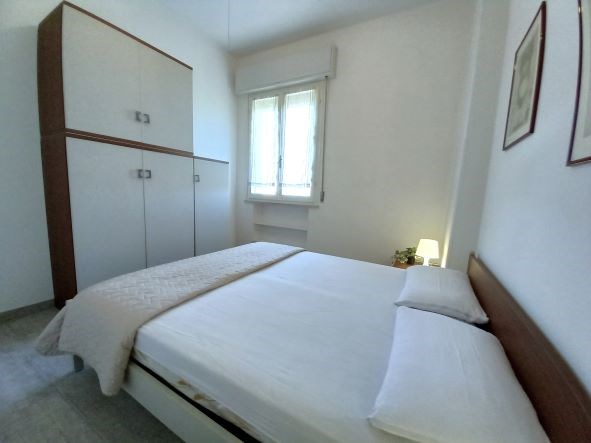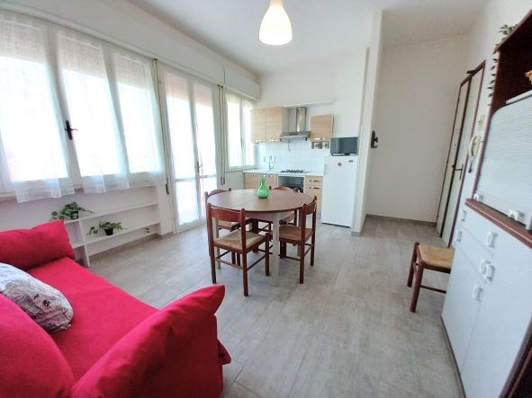 Lido di Classe. App. Severi 15. Appartamento al 4°piano, in palazzina con ascensore, composto da sala con angolo cottura, divano letto doppio, tv e balcone abitabile attrezzato con tavolo e sedie per mangiare fuori, una camera matrimoniale, una camera doppia/matrimoniale, bagno finestrato con box doccia e lavatrice, garage chiuso (per utilitaria) e possibilità di parcheggiare anche una seconda auto nel cortile condominiale, ingresso con cancello elettrico. 6 posti letto. Angolo cottura, divano letto, pavimento, bagno con box doccia nuovi appena installati.