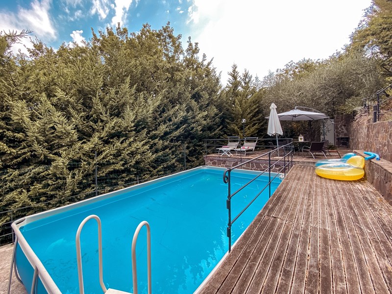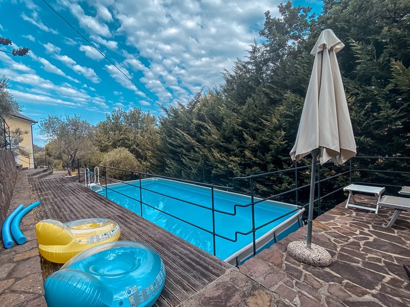 Sul retro della Villa, ampia terrazza e fascia di terreno circondata dagli ulivi con piscina esterna (come fa foto) e zona relax, oltre a piccolo locale tecnico.