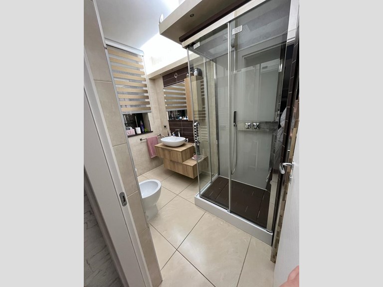 Piano terra zona giorno,ingresso su zona living,disimpegno,bagno finestrato con doccia,ampia cucina in muratura moderna,con top silestone bianco,dalla quale si accede alla veranda di mq 40,dotata di zona lavanderia separata,ripostiglio,copertura con tetto in legno,dotata di permesso,coibentato e ventilato,con 2 ampi finestroni,della velux,chiusura laterale vetrata con doppia camera a gas argon.
