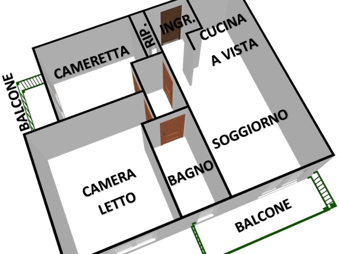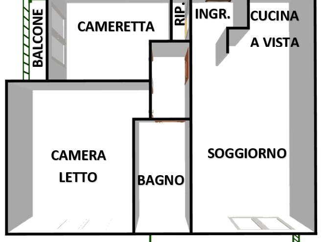 D’all’ingresso si accede ad un comodo soggiorno servito di ampio balcone (terrazzino), la cucina si affaccia direttamente sul soggiorno, il disimpegno collega direttamente la zona giorno alla zona notte, la zona notte è composta da un’ampia camera matrimoniale, una comoda cameretta servita di balcone, un grande bagno finestrato completo sia di vasca che box doccia.