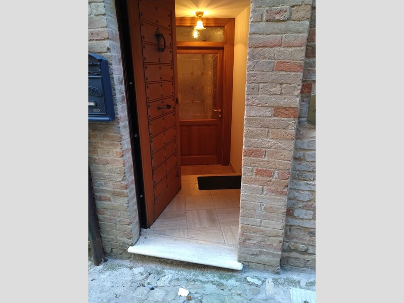 COSSIGNANO – Nell’incantevole borgo antico, casa cielo terra di circa 210 mq di recente ristrutturazione totale, composta da tre livelli fuori terra ognuno della superficie di circa 70 mq suddivisi in egual modo con disimpegno, piccolo ripostiglio, due locali e vano scale. Il piano terra è organizzato come zona giorno e i piani superiori come zona notte. Ogni piano ha un bagno a servizio. Divisibile facilmente anche in due o tre unità immobiliari (collocando la sola porta di piano), avendo gli impianti già tutti predisposti. Ha struttura in cemento armato, muratura in mattoni antichi da recupero faccia a vista all’esterno, pavimento piano terra in pianelle in cotto antico, piani primo e secondo in legno di rovere; scala rivestita in marmo travertino invecchiato con ringhiera in ferro battuto; rivestimenti bagni in ceramica monocottura formato 10x10 cm; sanitari sospesi e rubinetterie accessori dei bagni come nuovi; infissi esterni in legno Meranti, con inferriate di sicurezza al p.t., porte in castagno. Nel locale soggiorno del piano terra è presente uno stupendo camino in mattoni antichi e refrattari. Gli impianti di recentissima costruzione sono perfettamente a norma e il fabbricato risulta ben isolato termicamente e acusticamente. Rif 6293 DiLeoImmobiliare