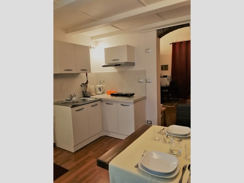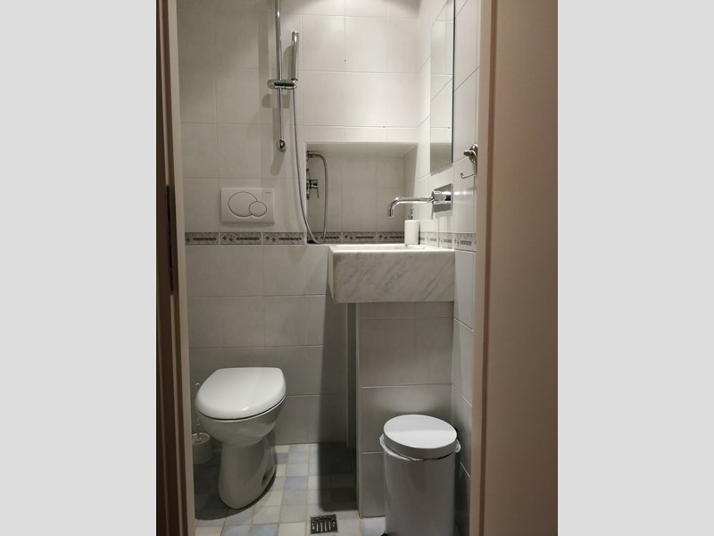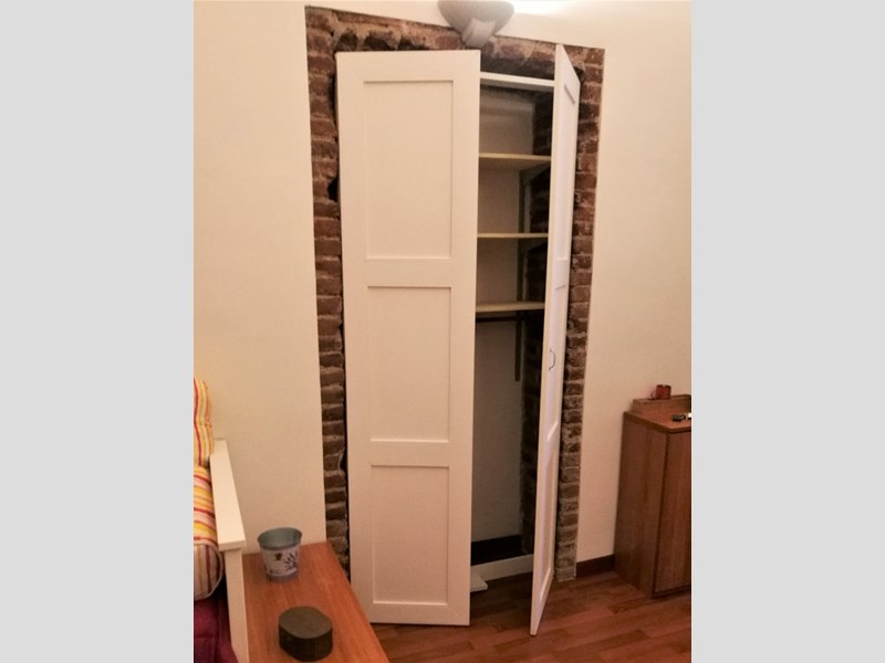 L’appartamento è composto da ingresso su cucina abitabile e piccolo bagno con lavabo in marmo di Carrara, wc e doccia con scarico diretto a pavimento (no box, no bidet). Dalla cucina si accede alla seconda più ampia stanza soggiorno/notte con armadio a muro, dotata di porta con vetro di sicurezza e protetta da saracinesca comandata elettricamente che affaccia su via Chiomonte.