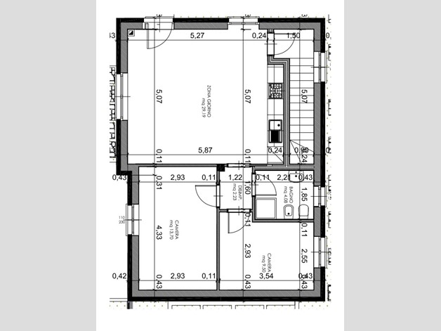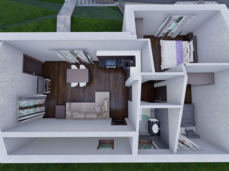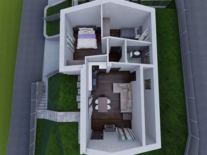 Le villette sono composte da un unico piano abitativo composto da zona giorno di circa con cucina a vista, 2 camere e bagno. Il piano abitativo è di 81 mq per una delle due villette, mentre per l'altra è di 73 mq.