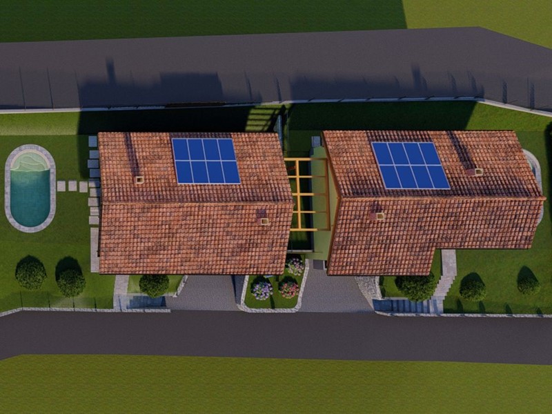 Due villette bifamiliari in costruzione con i migliori comfort abitativi: pompa di calore per acqua calda sanitaria, pannelli fotovoltaici per elettricità, riscaldamento a pavimento, coibentazione a cappotto.