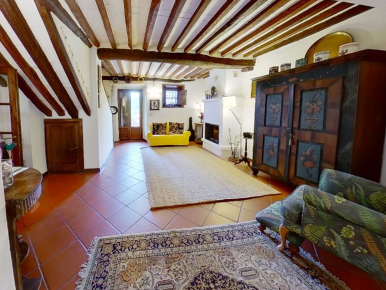 Gli interni sono accoglienti e raffinati: al piano terra troviamo un suggestivo porticato d’ingresso, due ampi saloni entrambi con camino, di cui uno con zona pranzo, una cucina rustica abitabile in muratura, due vani cantina (uno con zona lavanderia) e un ripostiglio. Il primo piano ospita un disimpegno, due camere, due bagni (di cui uno con vasca idromassaggio), due ripostigli e un forno a legna esterno. Al secondo piano si trovano tre camere, di cui una con camino, una con salottino e una terza con soppalco/studio, oltre a un bagno.
