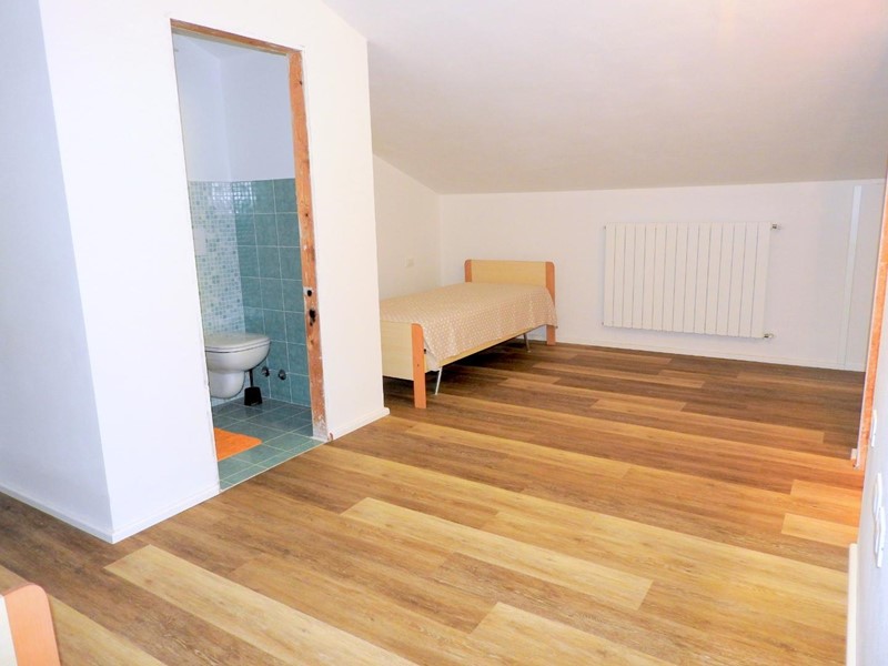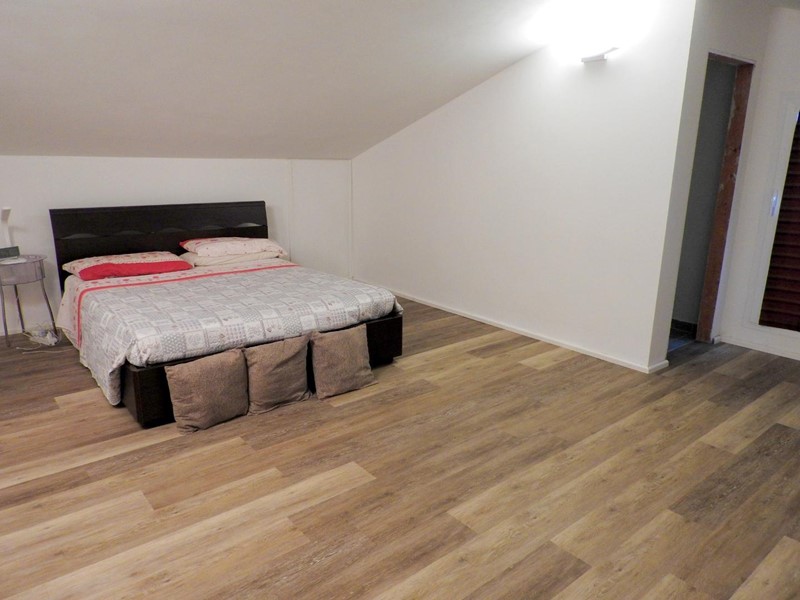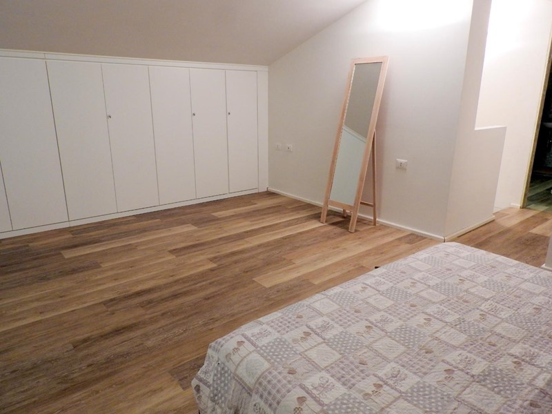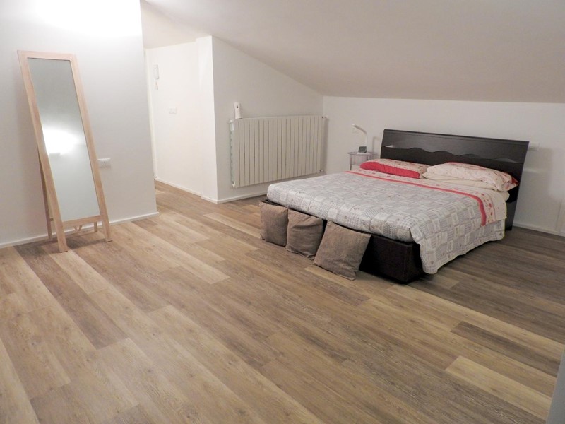 Tramite elegante scala interna in stile moderno si accede poi al locale mansardato di circa 60 mq, dove è ubicata la zona notte, suddivisa in due spaziose mansarde adibite a camera (una matrimoniale ed una doppia), ognuna delle quali dotata di bagno di servizio.