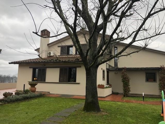 San Miniato, esattamente sul crinale di una collina, con un panorama a 360 gradi, elegante villa libera su quattro lati, dal design accattivante e dagli ampi spazi. La residenza, che si dispone su due livelli, oltre l’interrato adibito a garage e locali di servizio, è così composta: l’ingresso cede il passo, a sinistra alla grande zona pranzo, separata dalla cucina. A destra, l’imponente doppia zona living con camino è arricchita da delle vetrate da cui si può godere di una vista eccezionale. Ancora al piano terra, camera matrimoniale, servizio igienico e due dispense. Interessante il corridoio che conduce direttamente alla grandissima terrazza panoramica. Tornando nella zona living, si accede ad uno studio in doppio volume sul soggiorno, due camere da letto matrimoniali, ambedue con servizio igienico privato ed una terza camera o studio. Il giardino circostante è di circa 2000 mq. Una villa di charme e di luce.