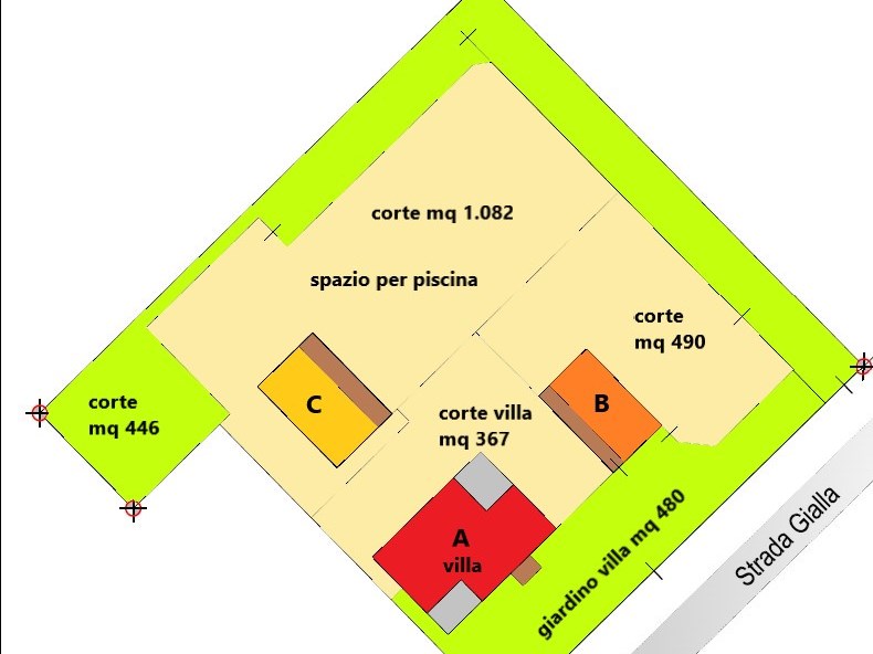 La corte di tutti fabbricati, di circa mq 2.870 è composta in parte da giardino e in parte con spazi liberi. RIFINITURE. Pavimentazione in gress porcellanato in zona giorno e in parquet doussie africa nella zona notte. Infissi in alluminio con doppio vetro e zanzariere. Portone d’ingresso del tipo blindato. Porte interne in legno noce. Ristrutturata nel 1998 oggi si presenta in buono stato di manutenzione. Per info e appuntamenti Andrea 3355769745
