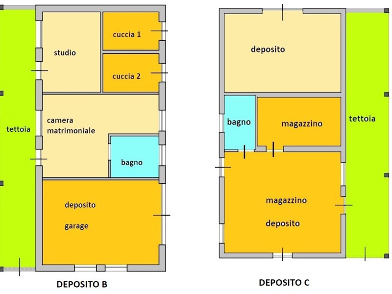 ZONA ESTERNA: 1° DEPOSITO (B) utilizzato come Dependance oltre al garage; 2° DEPOSITO (C) per ricovero attrezzi o magazzino ma dotato di bagno.