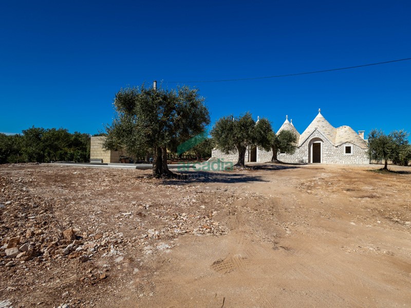 Arcadia Immobiliare propone in vendita a Martina Franca, nei pressi di Coreggia di Alberobello, un complesso di trulli di nuova costruzione con piscina a sfioro, su lotto di 8.000 mq recintato. L’immobile, ad energia quasi zero grazie a impianto fotovoltaico e tecnologie moderne, ha una superficie coperta di circa 130 mq, suddivisa in due unità indipendenti (5 camere, 2 soggiorni, cucina, 2 bagni) facilmente unificabili. Dotato di riscaldamento a pavimento, fan coil e infissi performanti. Consegna “chiavi in mano”.
