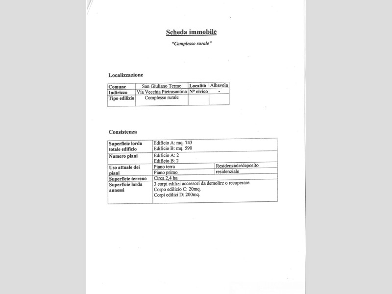 Complesso edilizio rurale composto di due case coloniche attualmente suddivise in 4 unità immobiliari in un'area di grande valore paesaggistico, compresa nel parco Migliarino San Rossore. Fanno parte della vendita tre annessi della superficie lorda di 200 mq. IL COMPLESSO EDILIZIO è CIRCONDATO DA 2,4 ETTARI DI TERRENO. Gli edifici colonici si trovano in un complesso di stato di abbandono, e necessitano pertanto di un intervento di ristrutturazione completo, favorendo il mantenimento delle caratteristiche architettoniche di valore storico caratterizzanti (solai di orditura primaria e secondaria in legno e scempiato in mezzane, volte a crociera, scale in pietra serena). L'edificio piu piccolo è parzialmente ristrutturato e abitato da poco tempo.